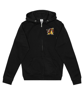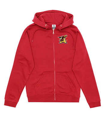 Adult Full Zip Hooded Sweatshirt. 50% Cotton/ 50% polyester preshrunk 13.5 oz. color-matched drawstring. Front Pouch Pockets. Embroidered Logo on left chest.