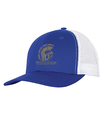 Five-panel Classic Mesh Trucker Hat. Features include 5 panel flat bill Vintage style front with classic mesh backing and snap-back closures. School logo embroidered on front centre.